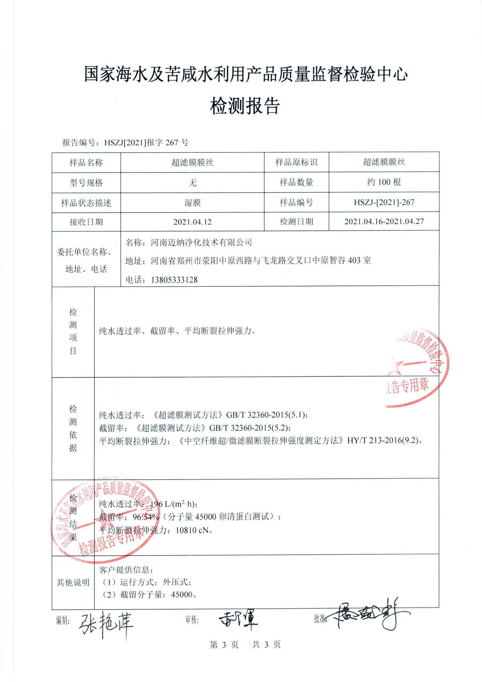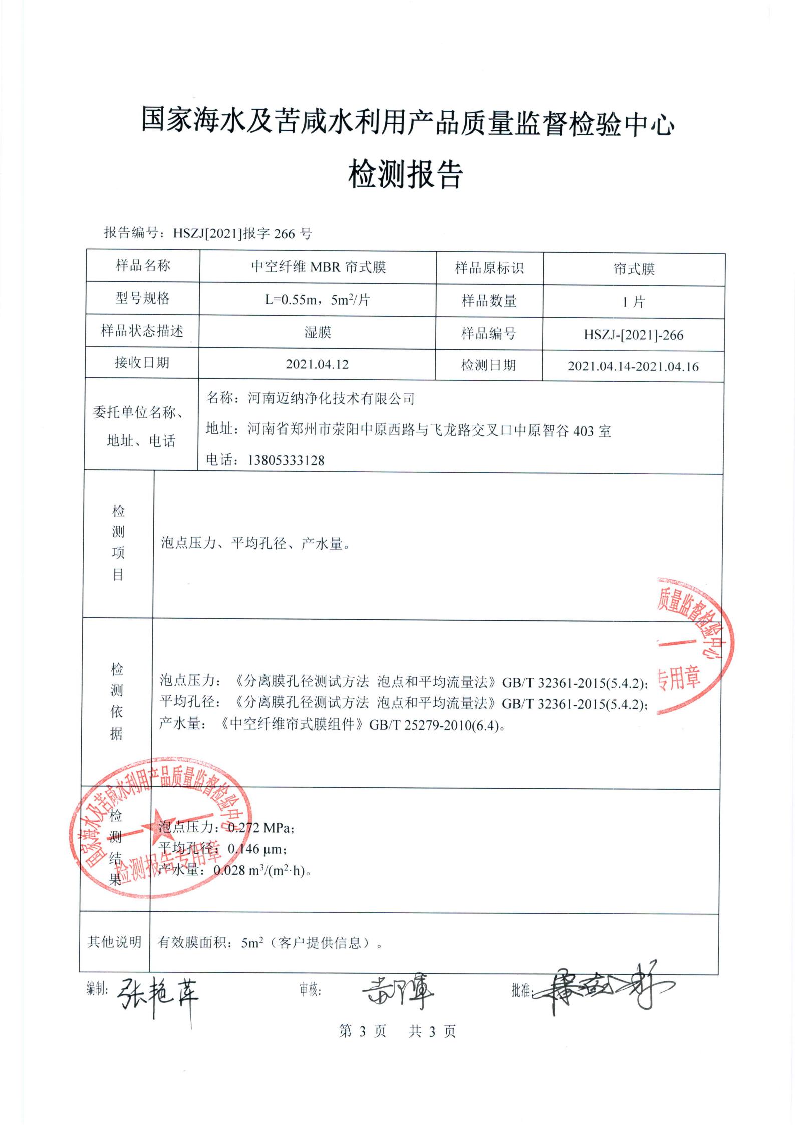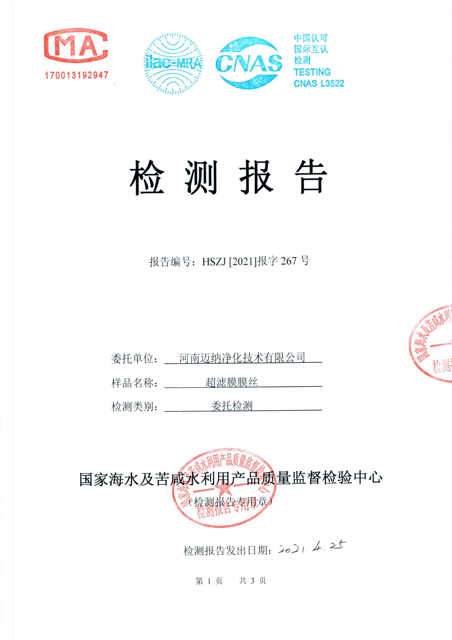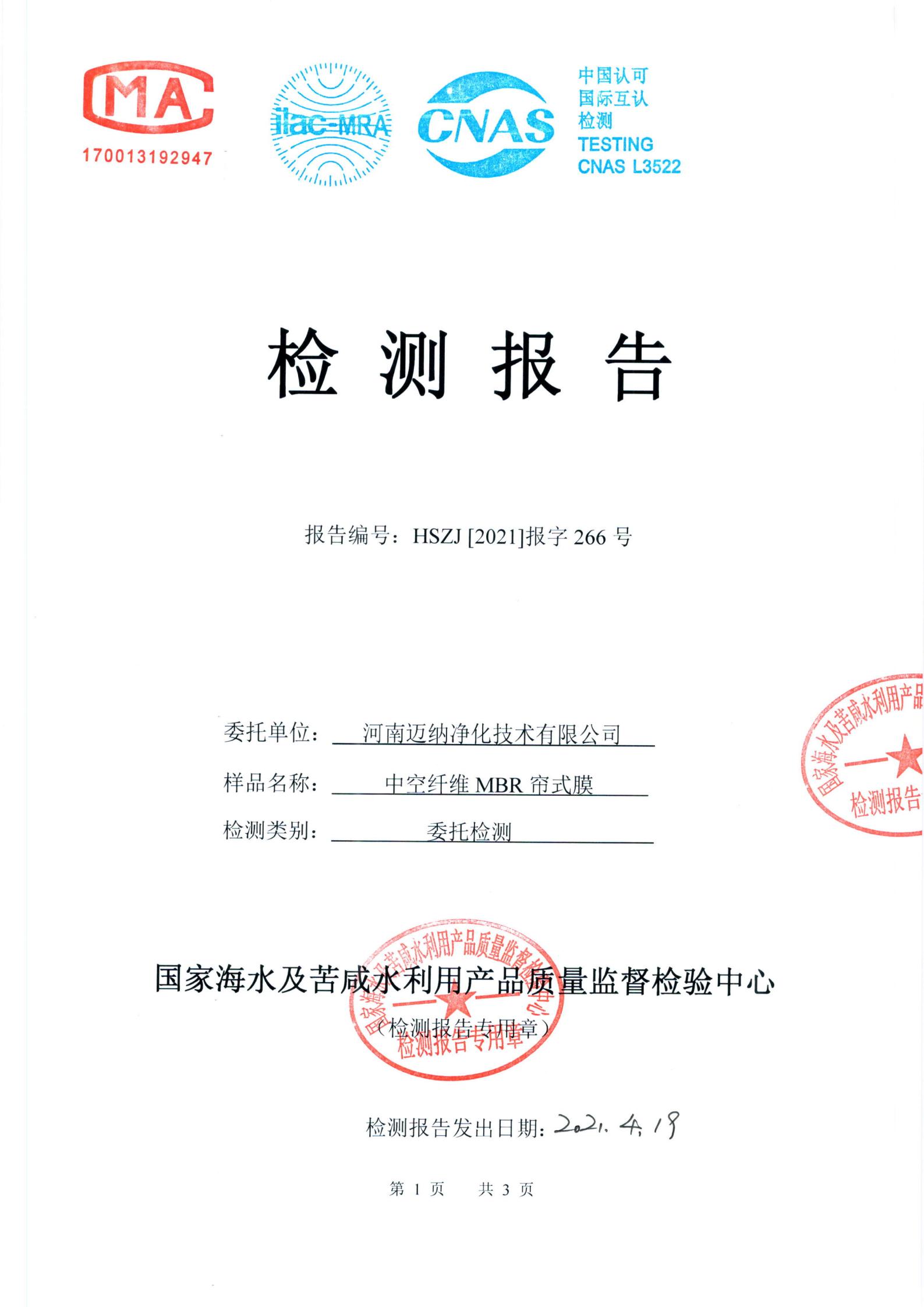 河南邁納凈化技術(shù)有限公司膜產(chǎn)品檢測(cè)報(bào)告
